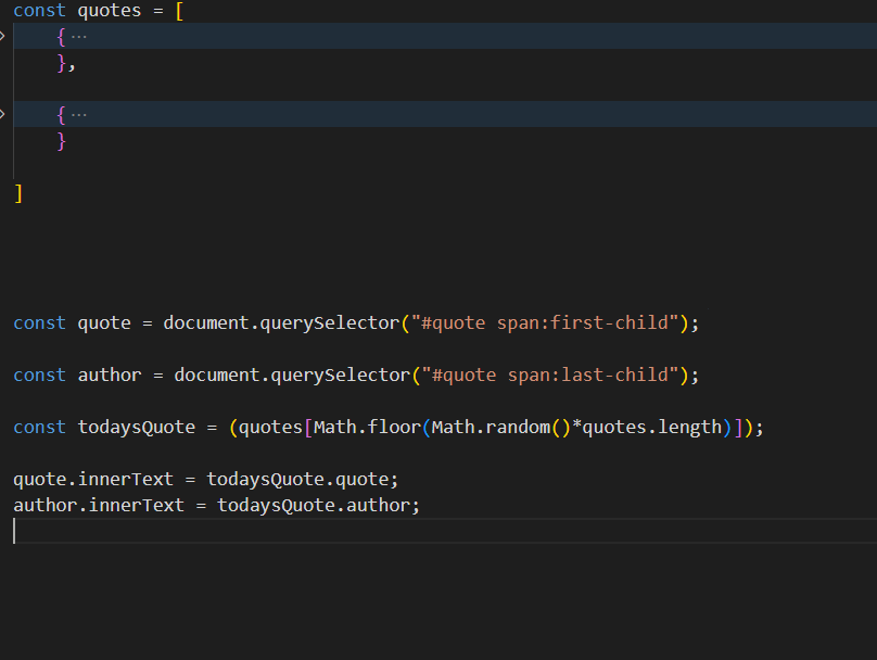 const todaysQuote = (quotes[Math.floor(Math.random()*quotes.length)]); // Math.random -> 이 기능으로 내가 나열한 명 언을 랜덤으로 보여준다.